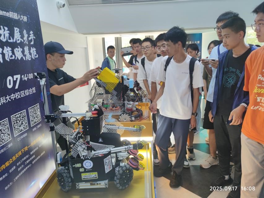 随后,班级特地邀请学院2023级本科生赵博翔等学长做Robogame比赛作品实物讲解。他带来了他的参赛作品——一台能够夹取并弹射物品的机器人。他详细介绍了机器人的机械结构设计、传感与控制系统及弹射动力机制,并进行了现场演示,引来同学们阵阵惊叹和掌声。赵博翔分享了自己备赛过程中的心得体验,鼓励学弟学妹们“大胆想、动手做、不怕错”,在实战中不断提升工程能力。